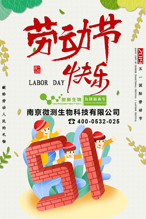 南京微測生物科技有限公司祝新老客戶朋友五一勞動節(jié)快樂!友情提示:2019年5月1日起至2019年5月4日放假,共計4天,放假期間不發(fā)貨,5月5日上班恢復正常發(fā)貨。
